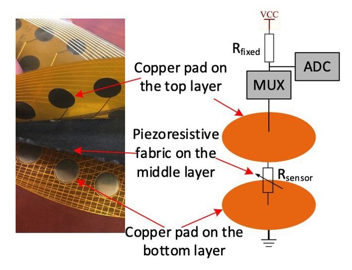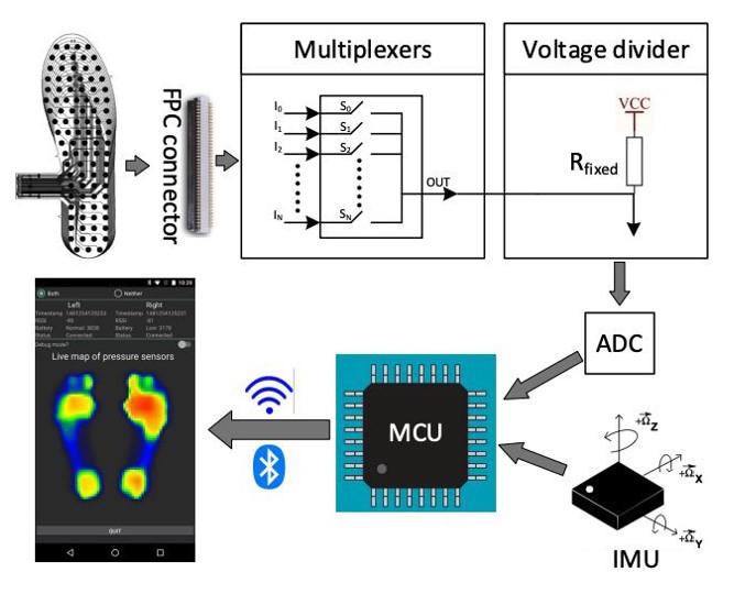 - Figure 2: Diagram of the signal processing circuit board. Moreover, a pressure sensor array can be used to record a pressure distribution in gait analysis and/or tactile sensing applications. The pressure sensor array can include a piezo-resistive material and a uniform distribution of a plurality of flexible circuits. Each of the plurality of flexible circuits comprise at least one wire connecting an internal portion of a respective flexible circuit to a common port. A device housing the pressure sensor array can be trimmed to a size and used for a gait analysis and/or tactile sensing application. The arrangement of the wiring permits partial sensors to be used as part of the pressure sensor array during the gait analysis and/or tactile sensing applications.